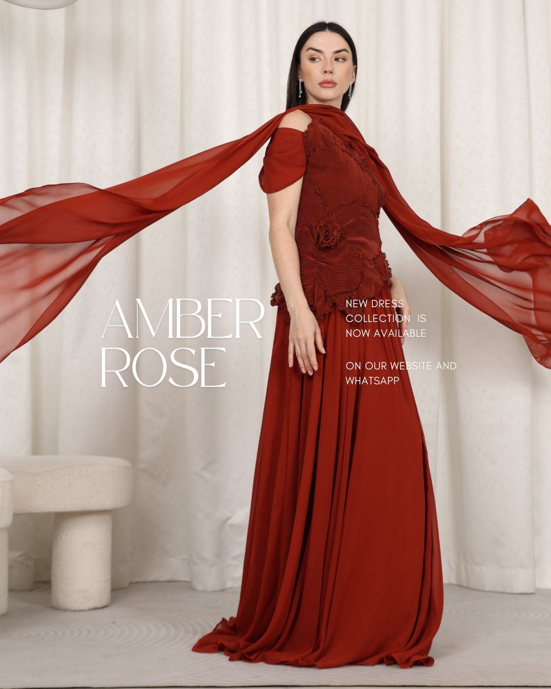 فستان ماكسي بقماش كريب مصمم بشكل انسيابي وبسيط مع تصميم بتلات ورد متفتحه بقماش الأورجنزا...
