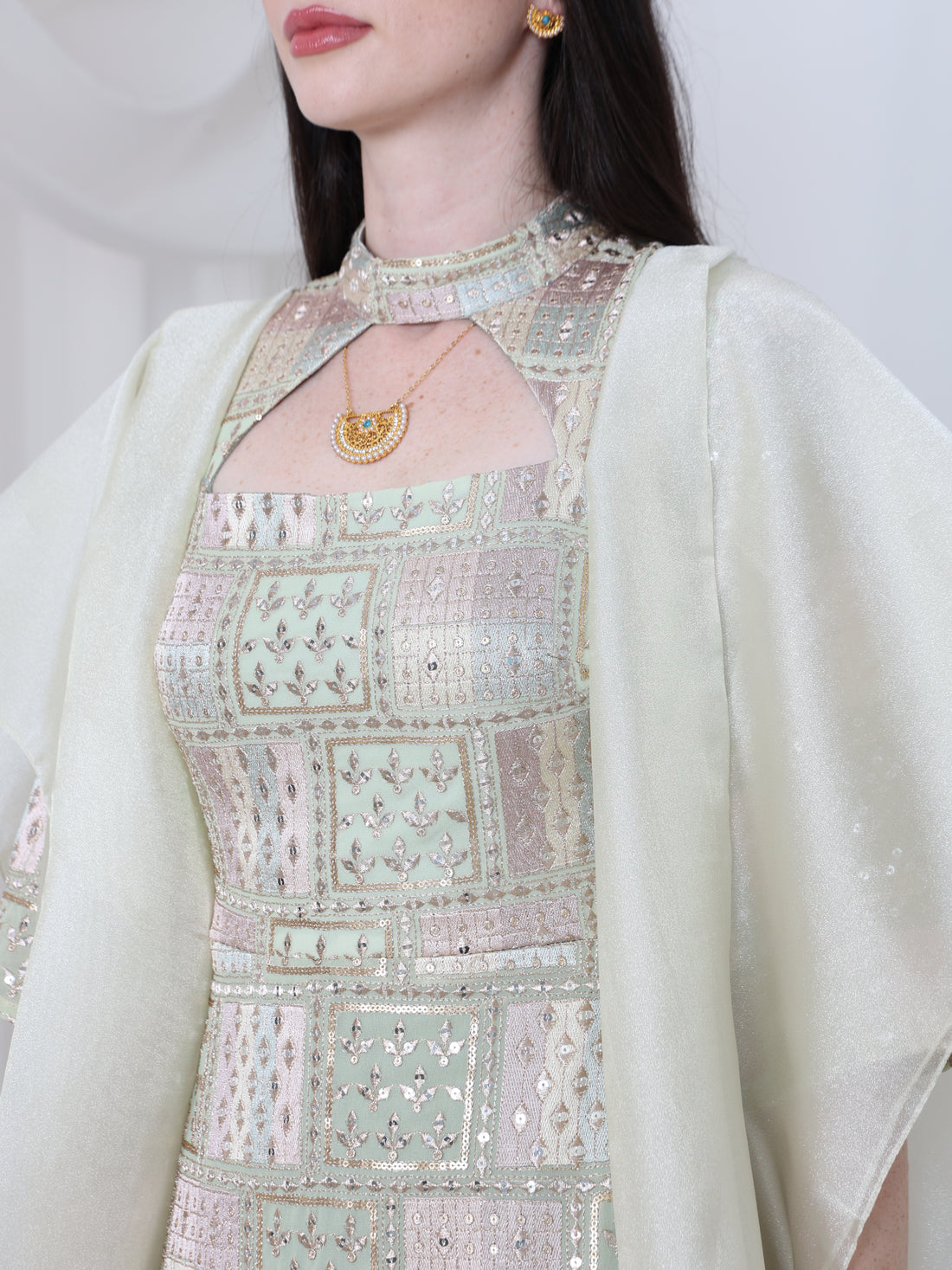 فستان سليف لس بقطعة مشغولة شغل يد ومع كيب إضافي برقبة وأكمام منسدلة اورجنزا