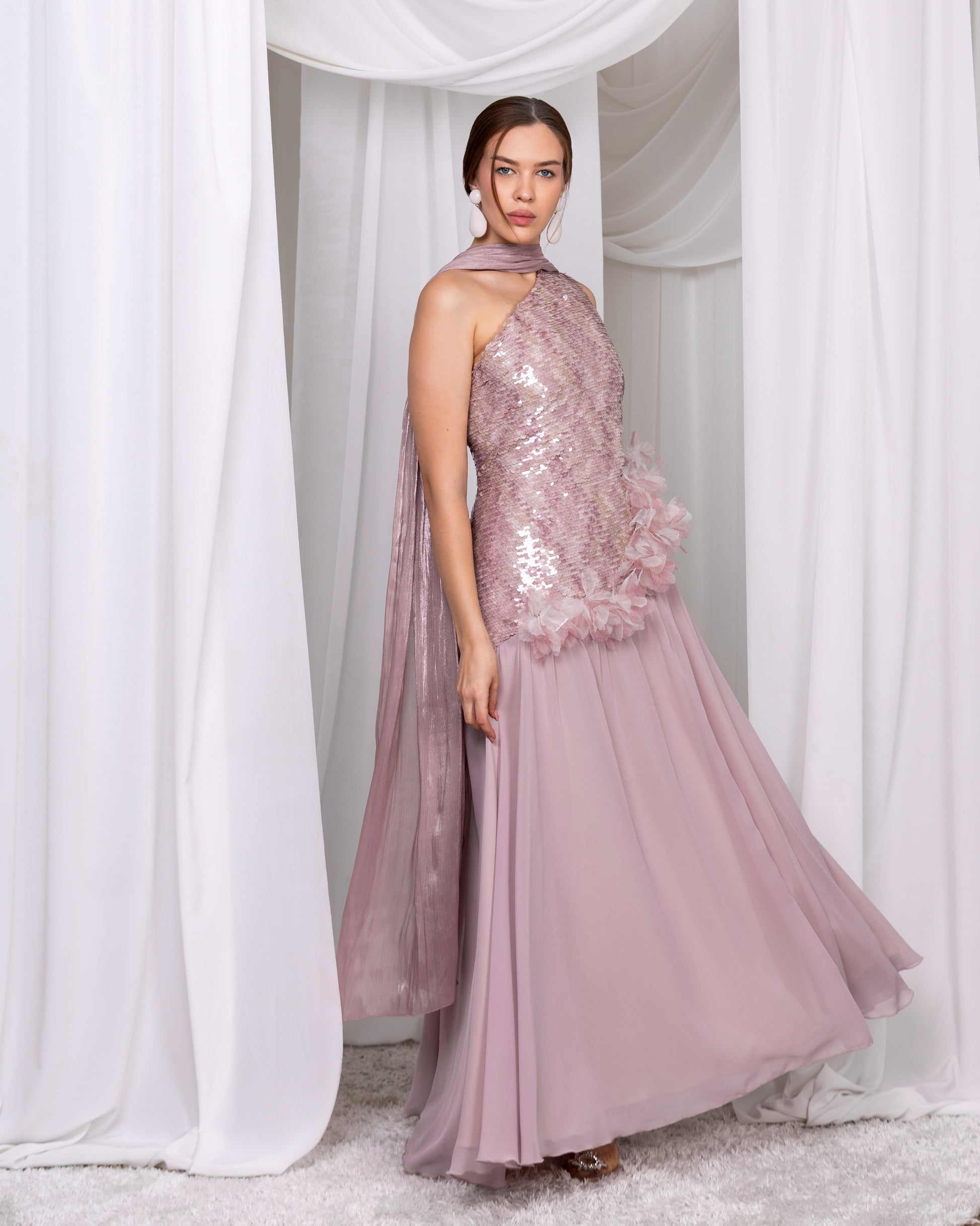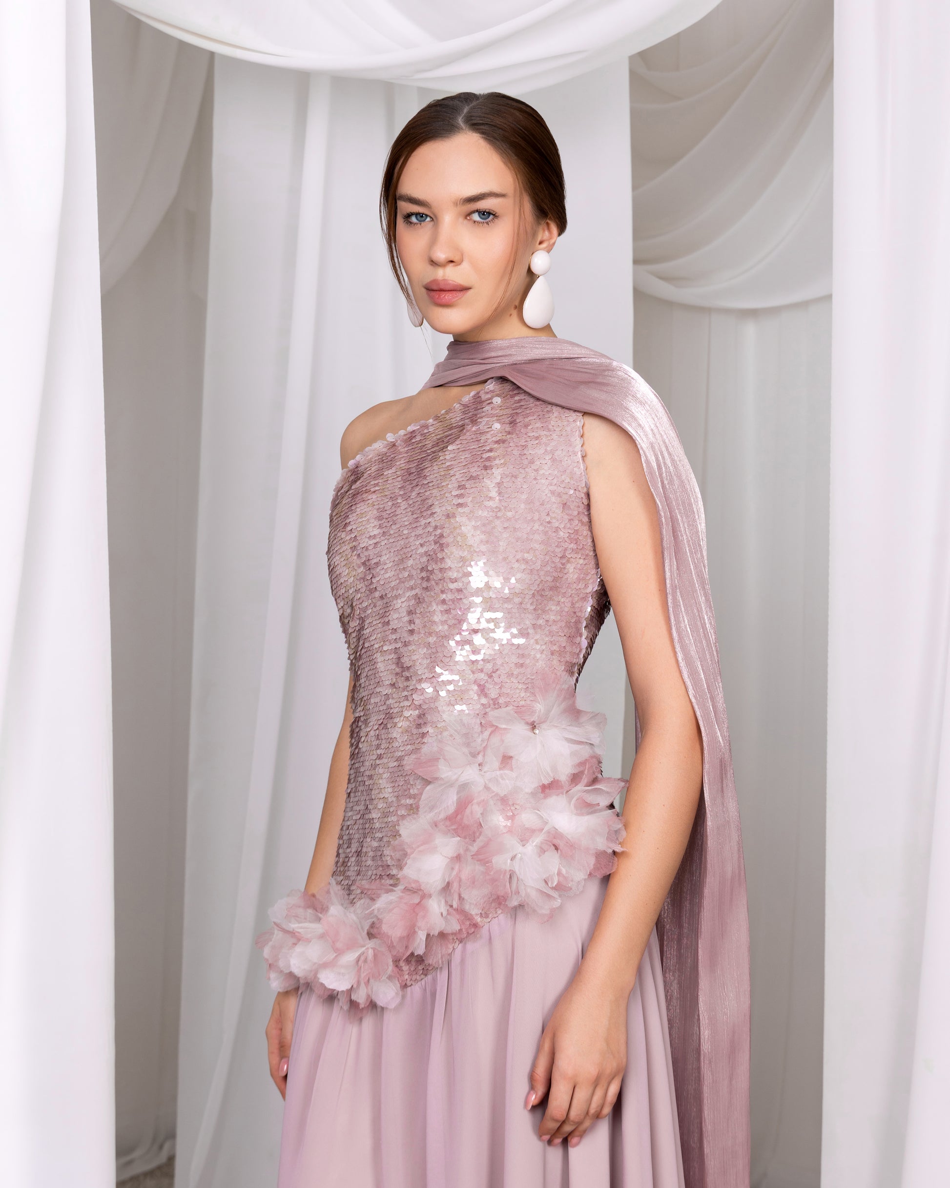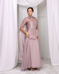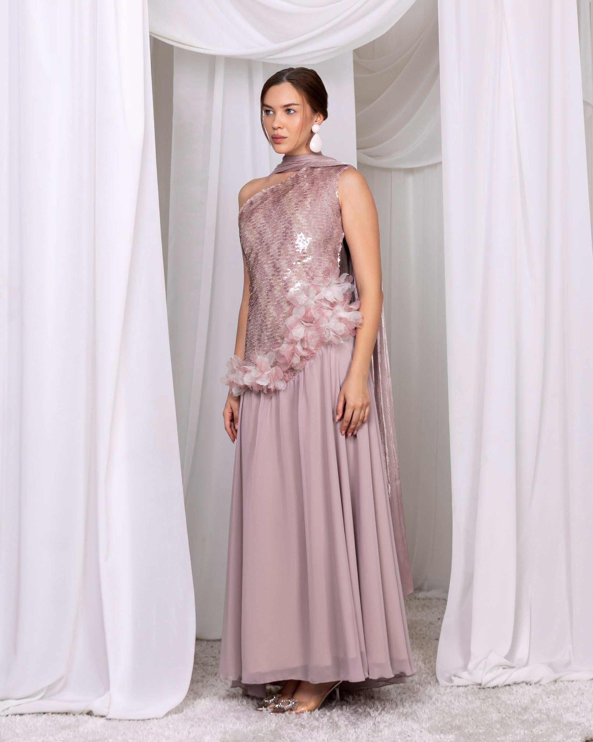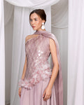 فستان اوف شولدر بقصة كلوش قماش سيكونيس وشيفون مع شال اورجنزا ناعم