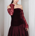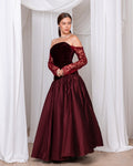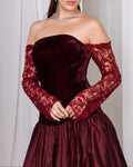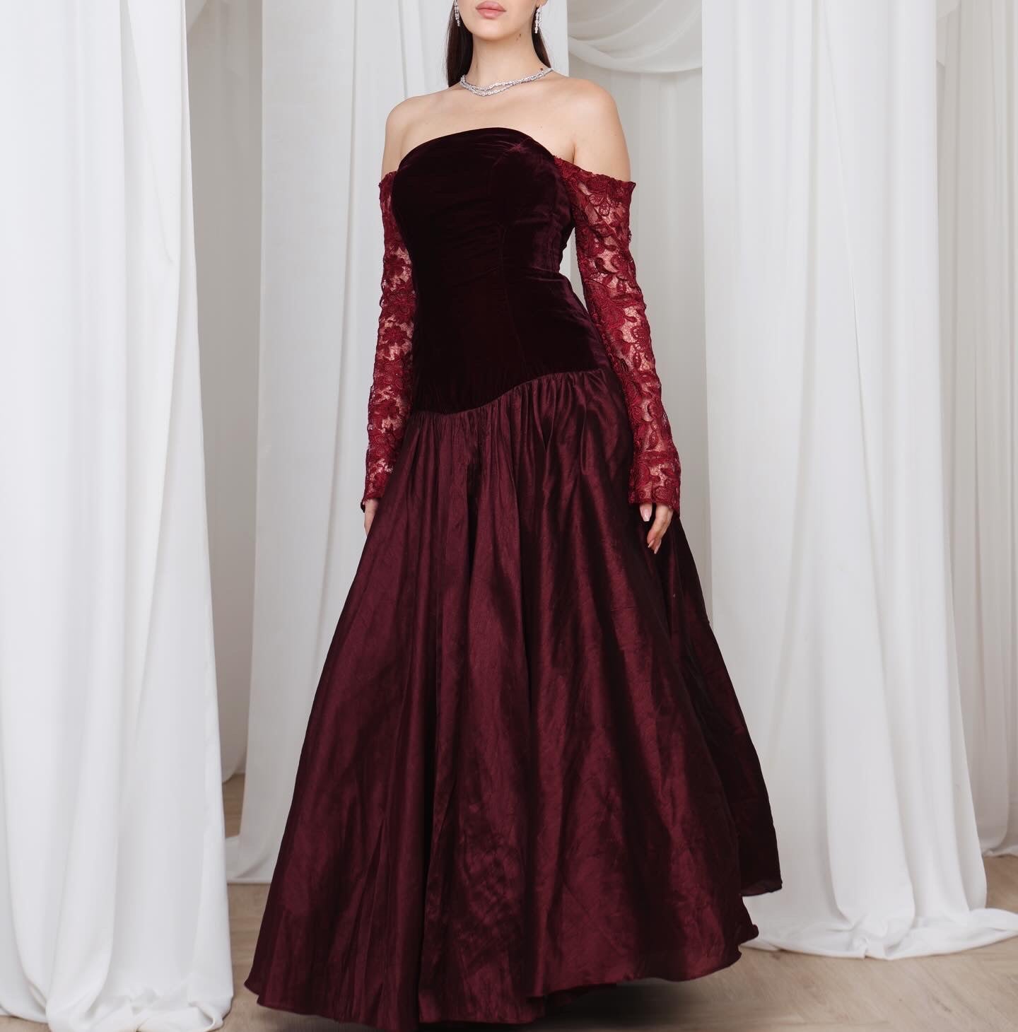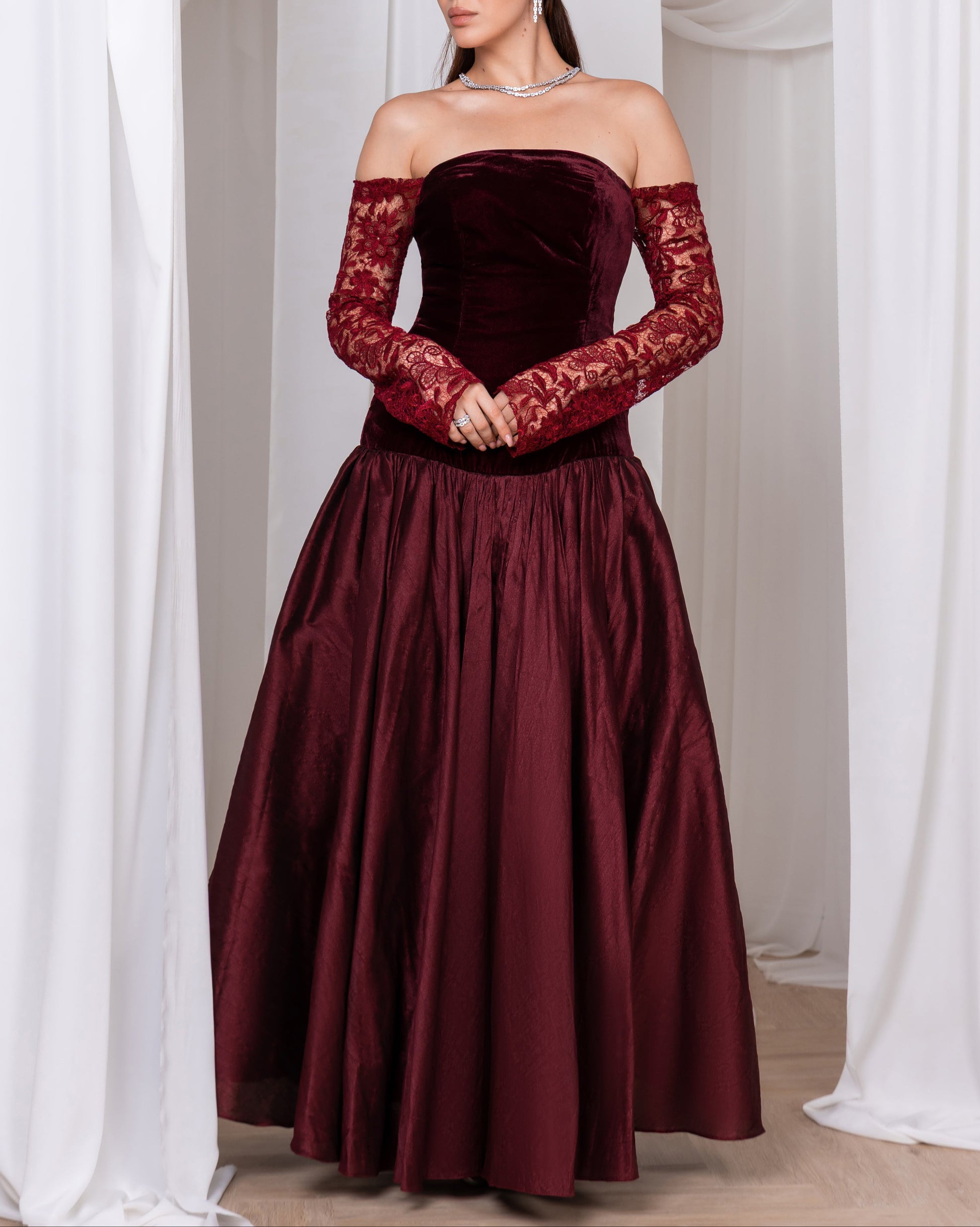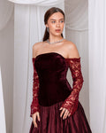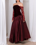 فستان اوف شولدر بقماش مخمل كورسيه مع قماش حرير هندي وأكمام طويلة دانتيل