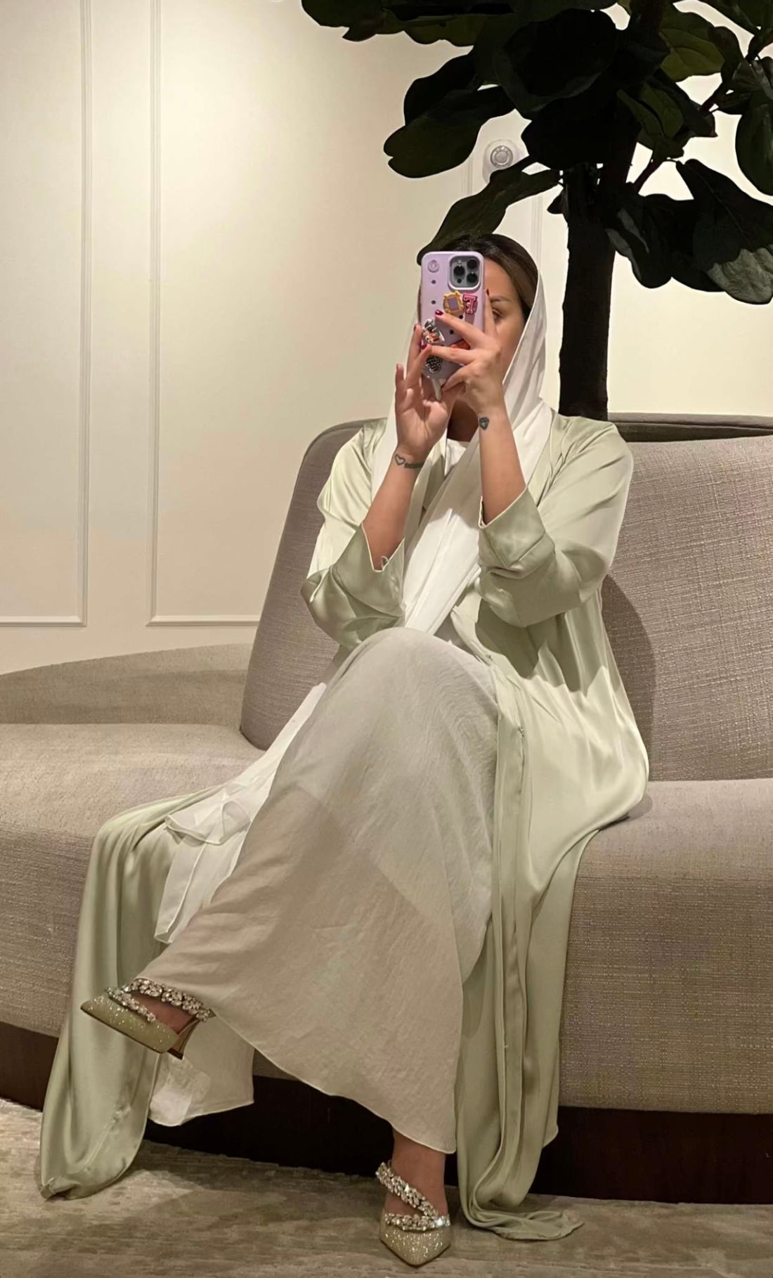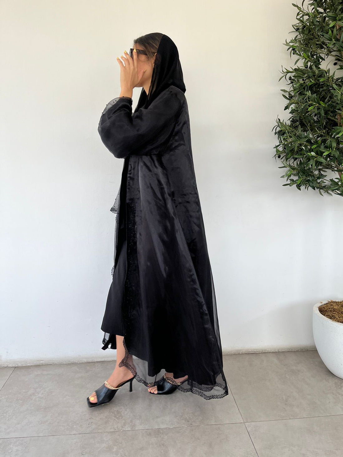 Bahraini cut abaya, doubled material organza and washed silk with beaded crystals lengthwise and cuff...