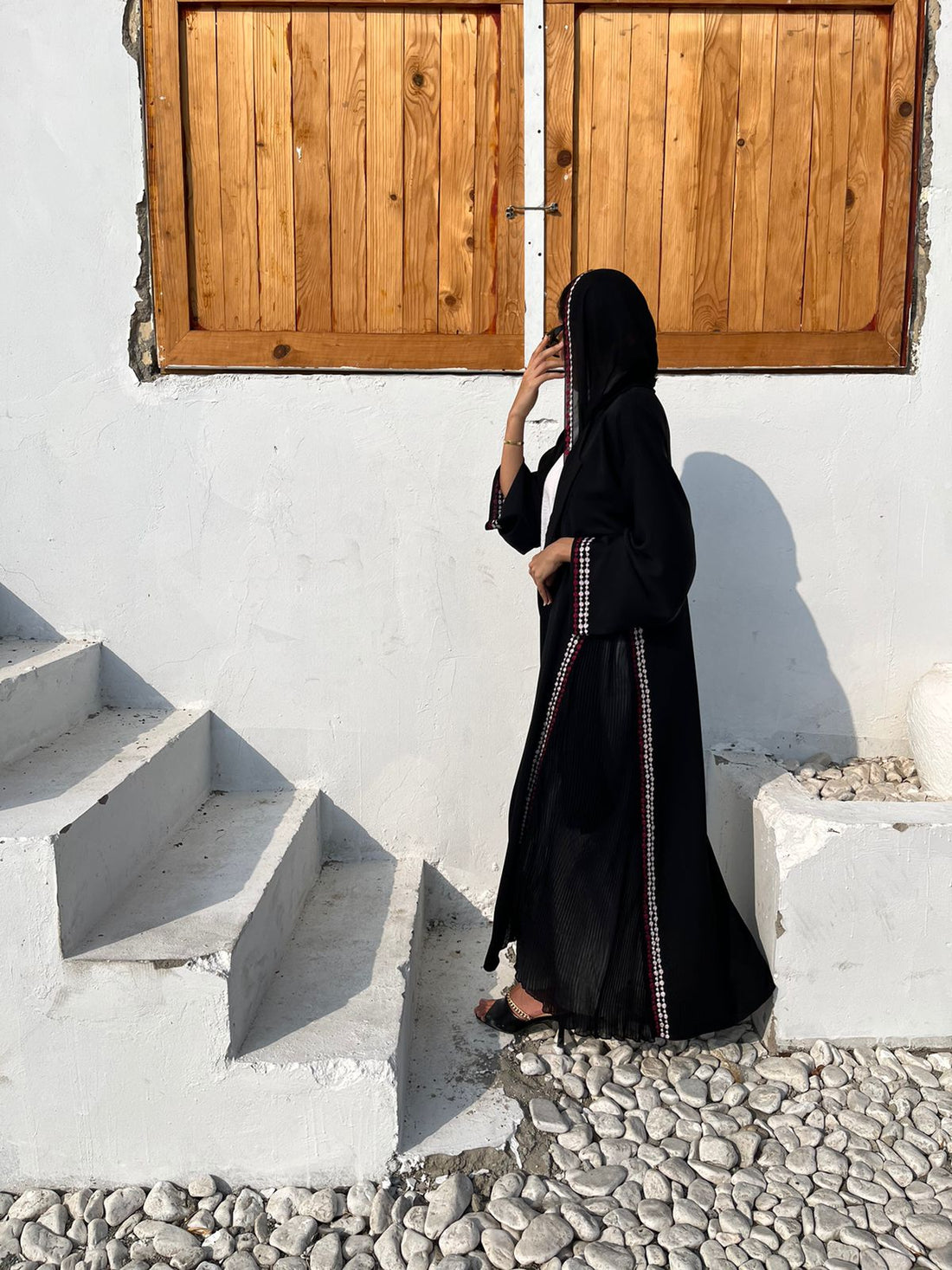 Bahrani cut abaya creep material and linnen material on cuff and Shela beaded with stones