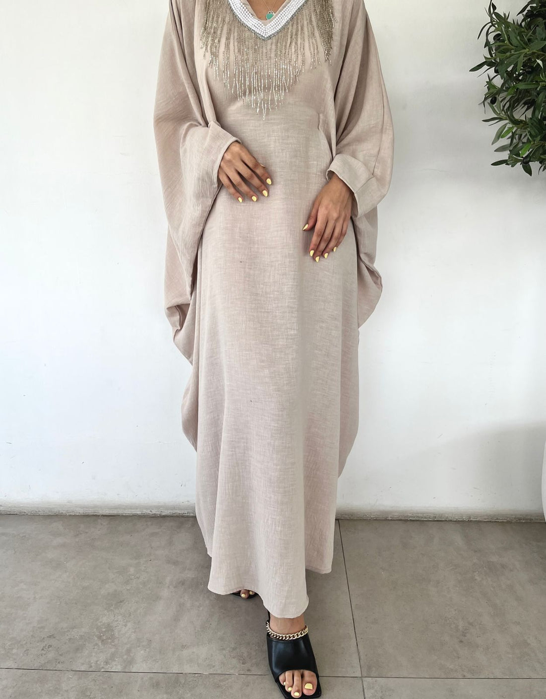 Bahraini cut, long sleeve dress with inner belt, v-neck beaded pearls