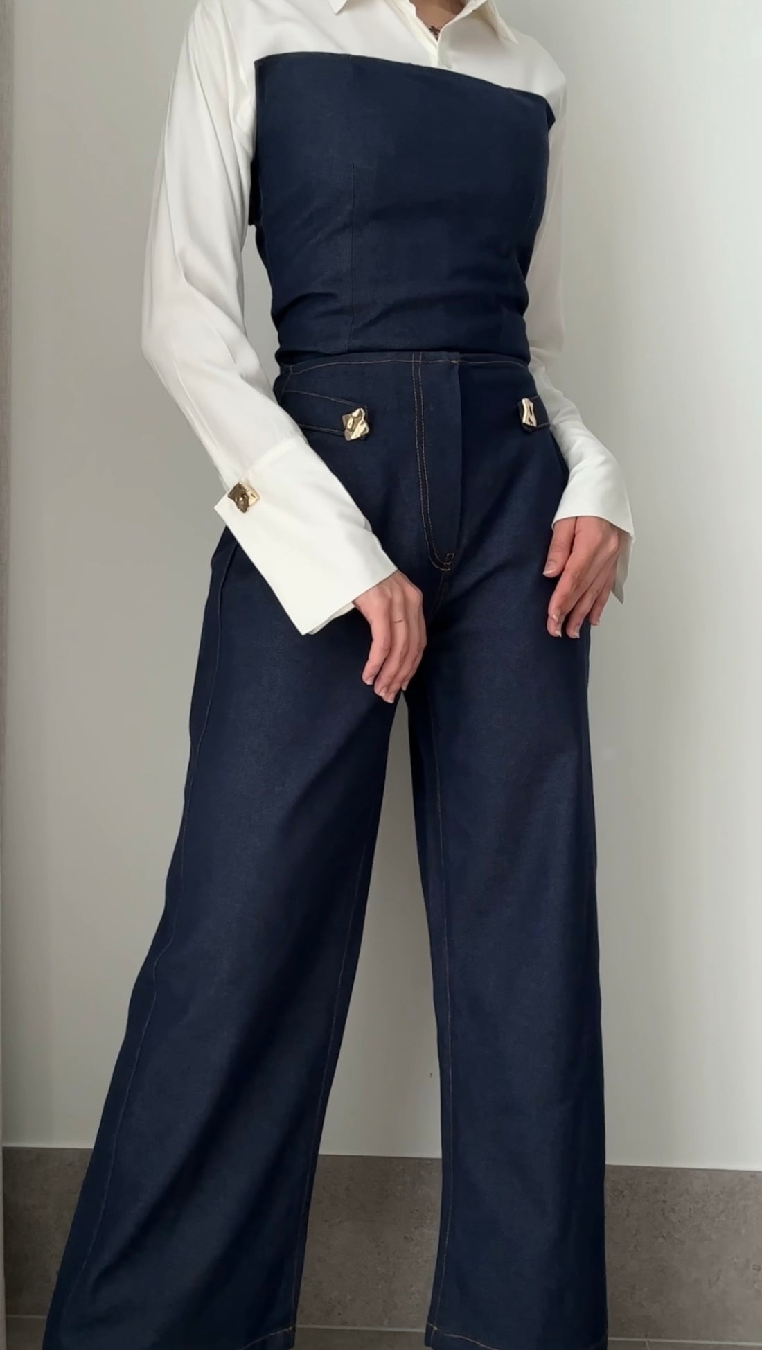 بنطلون جينز بقصة مستقيمة وانحناء بسيط عند الخصر مع توب جينز
