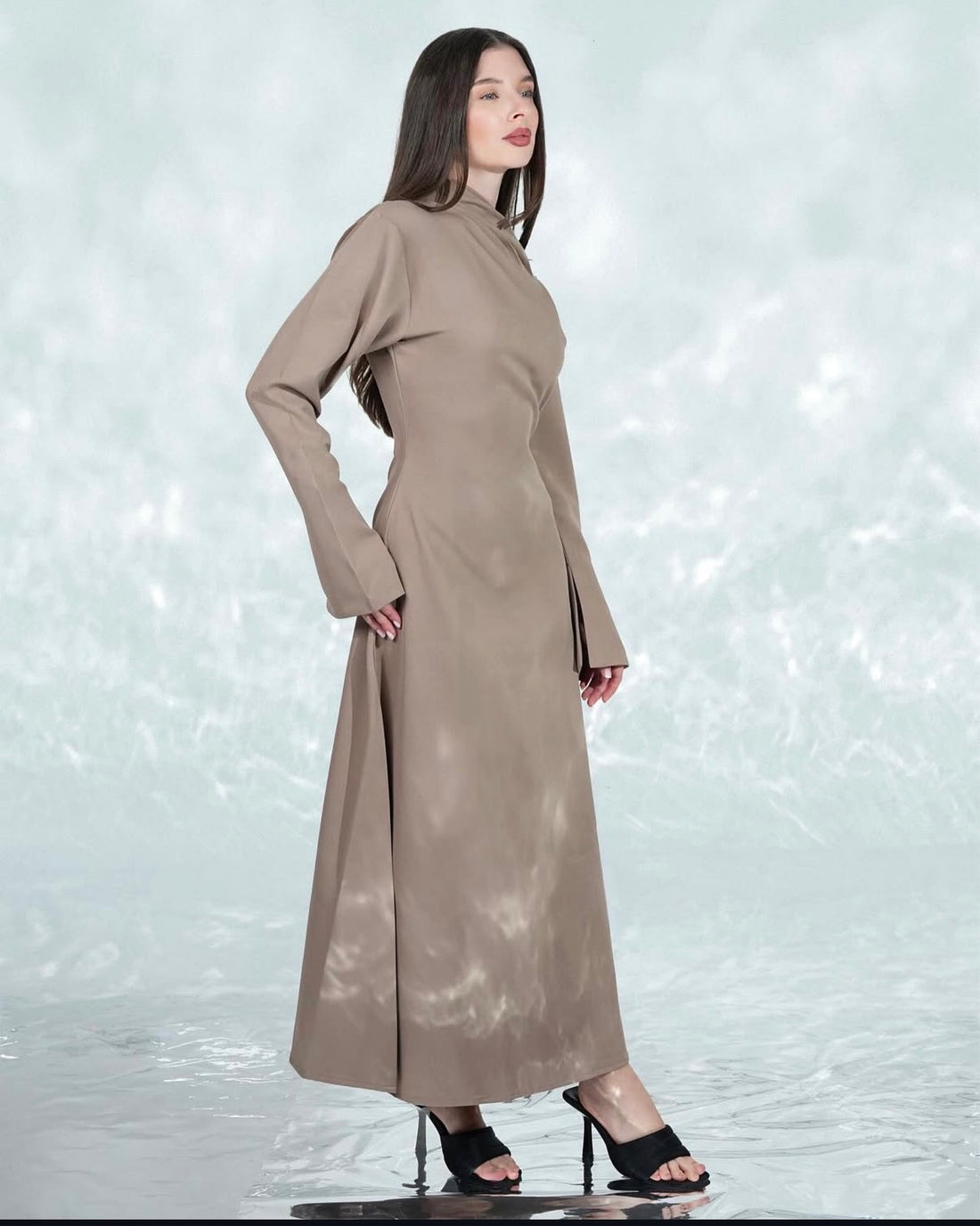 فستان مكون من قطعتين فستان داخلي بقماش كريب خفيف وفستان خارجي دانتيل عالي الرقبه بقصة...