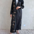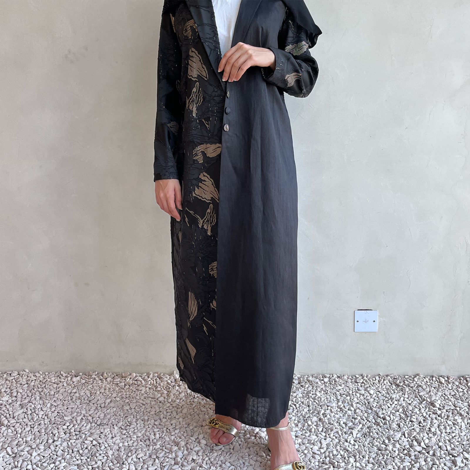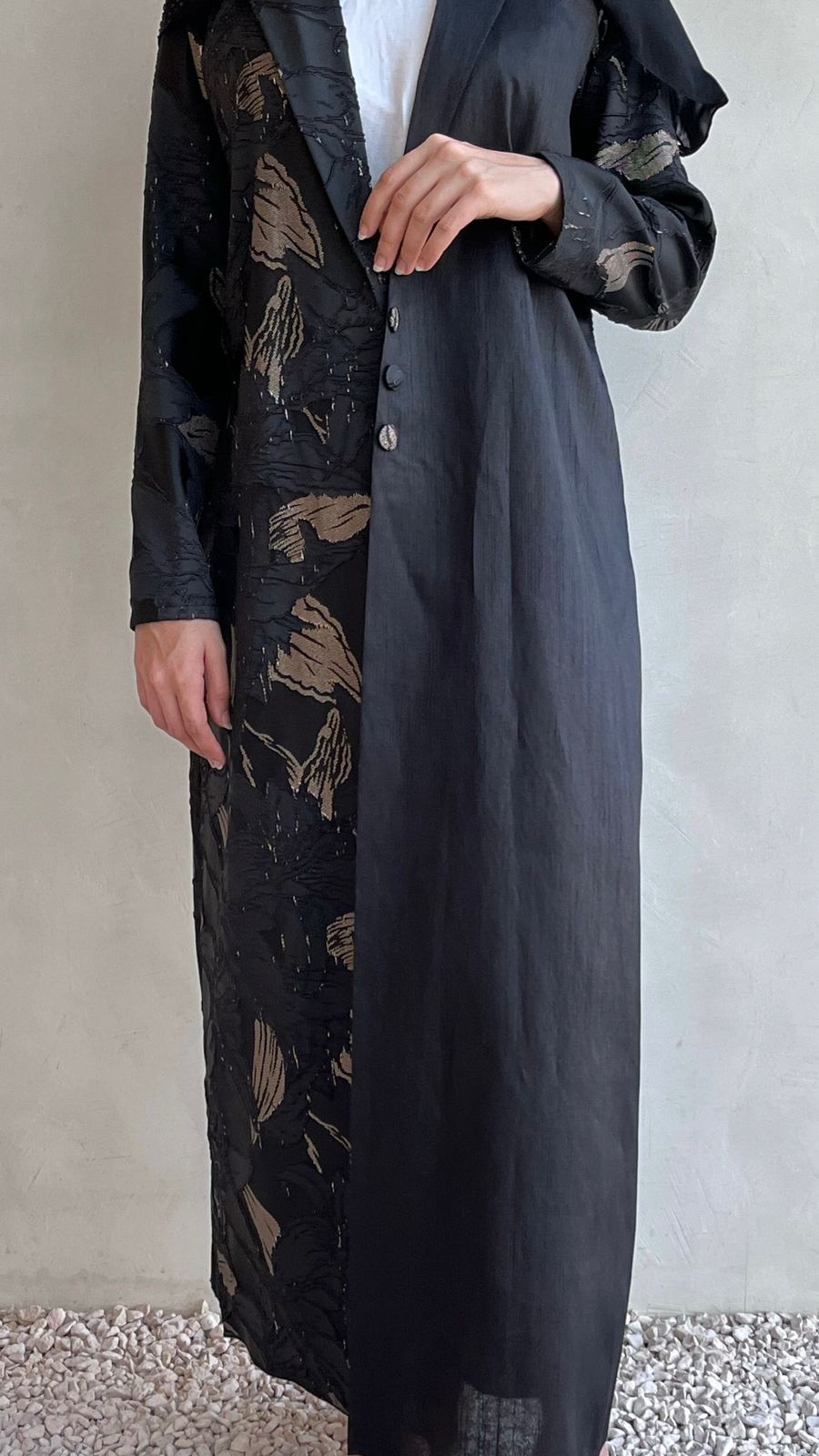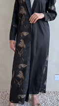 cross abaya Indian silk with v neck plain martial in one side and opposite side patterned autumn leaves material