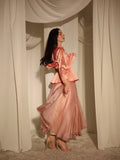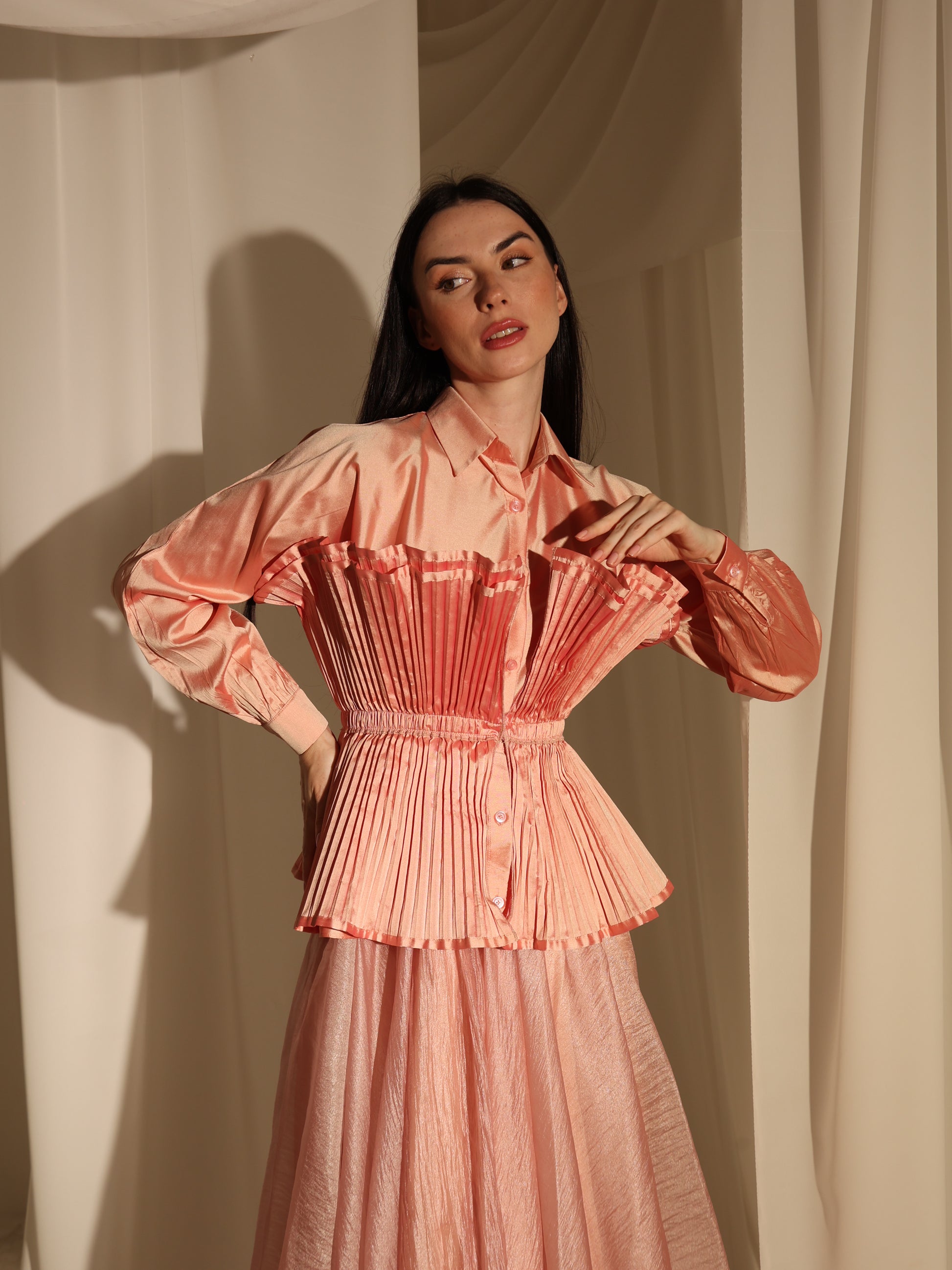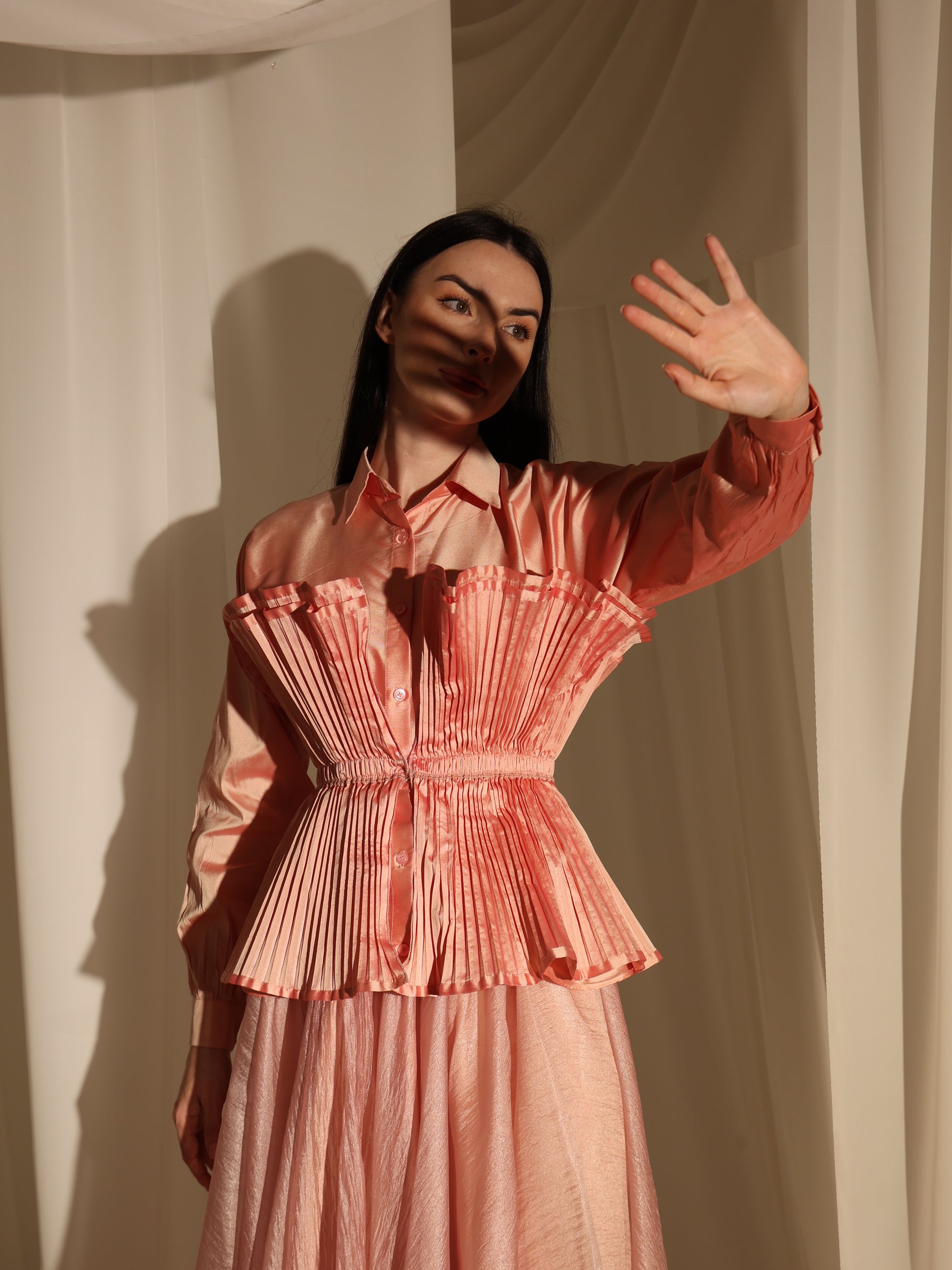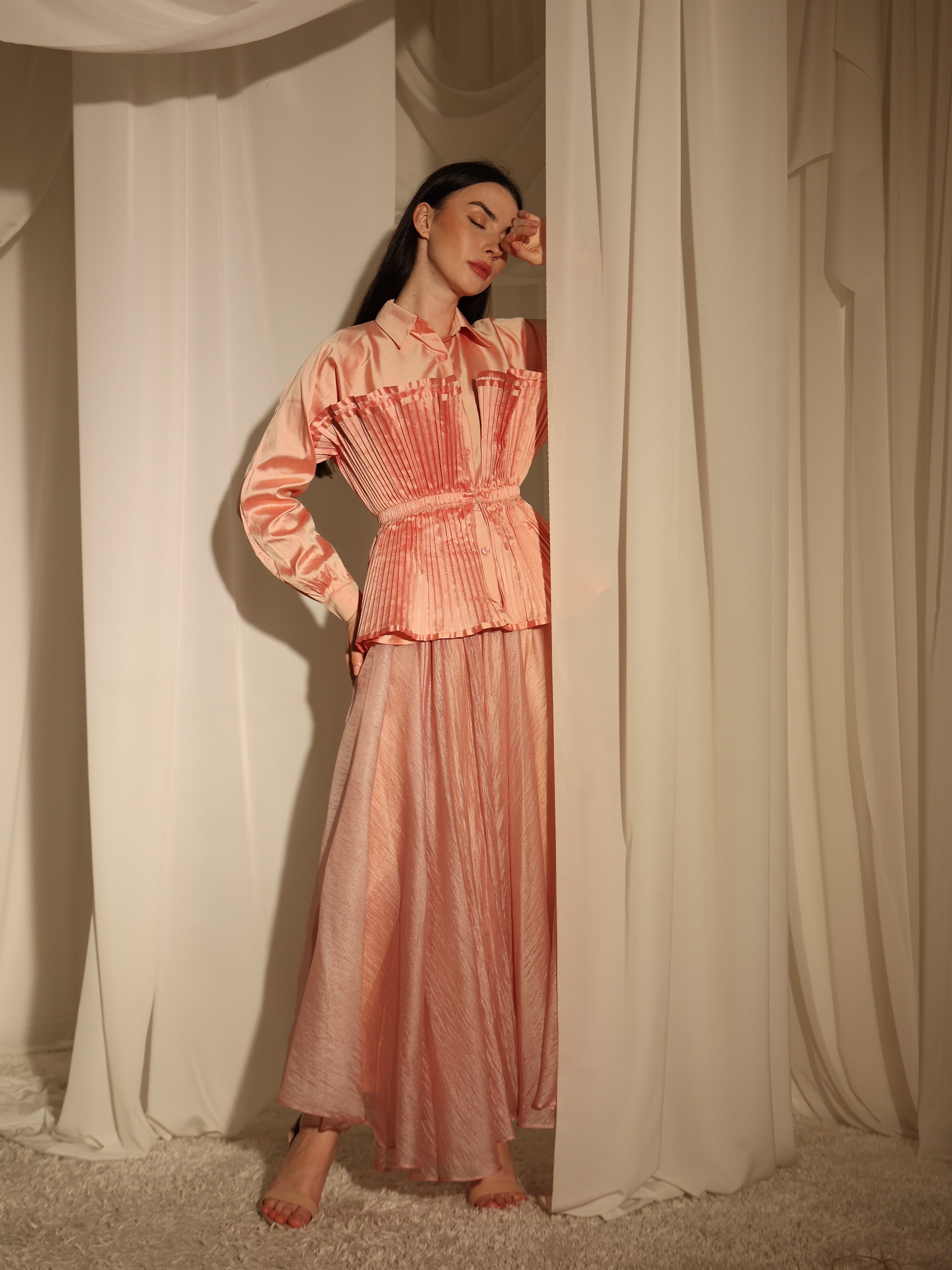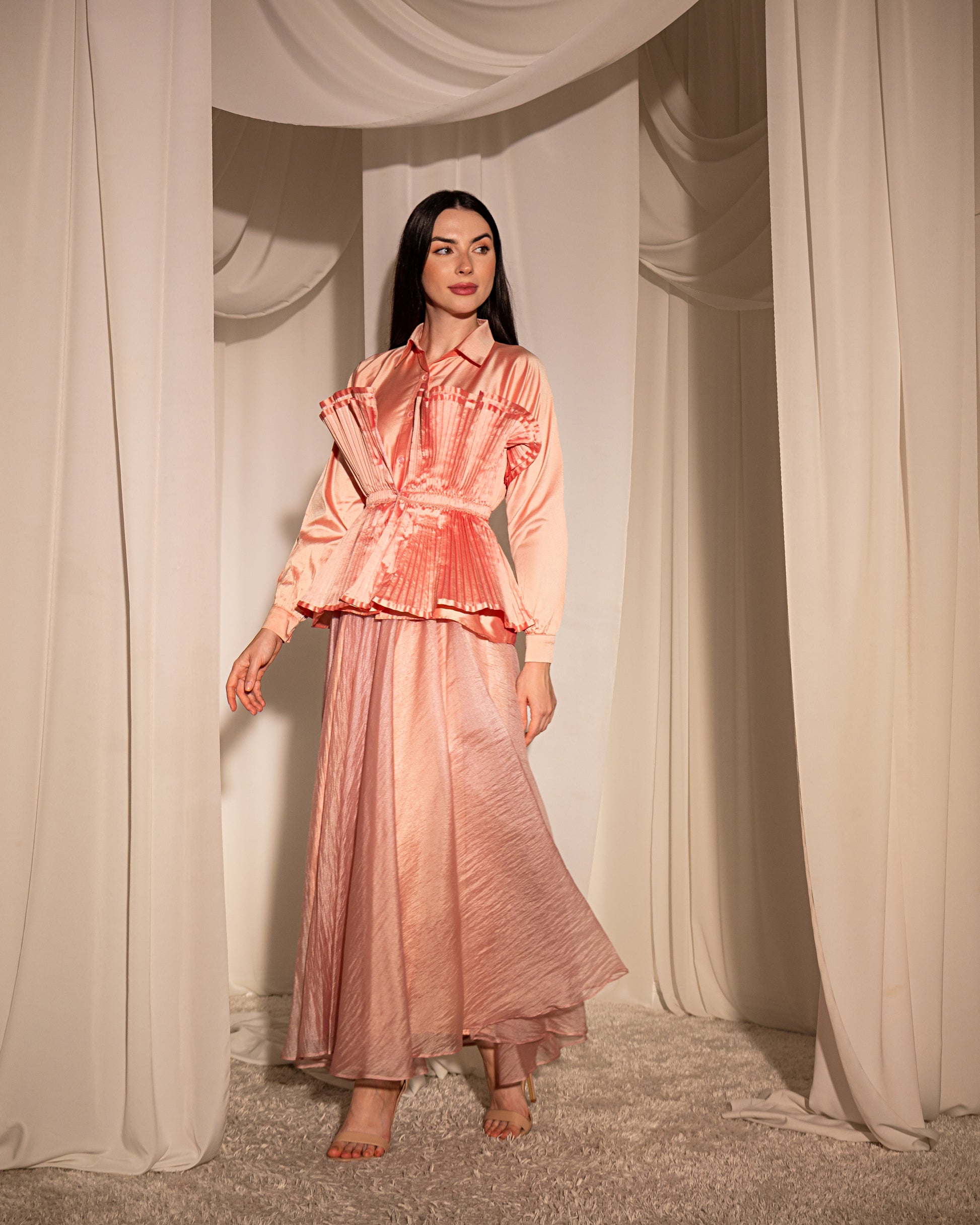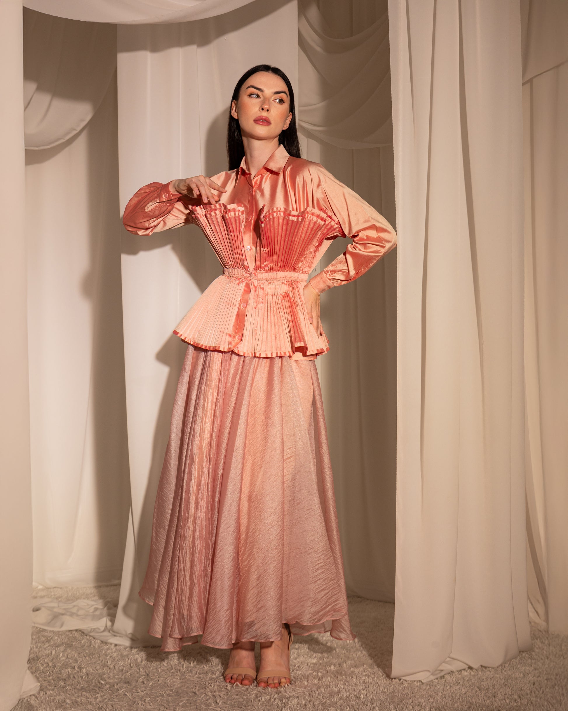 بدلة مكونه من قميص بقماش تفته خفيف وتنوره بقماش. اورجنزا ناعم وحزام عريض .
