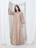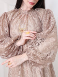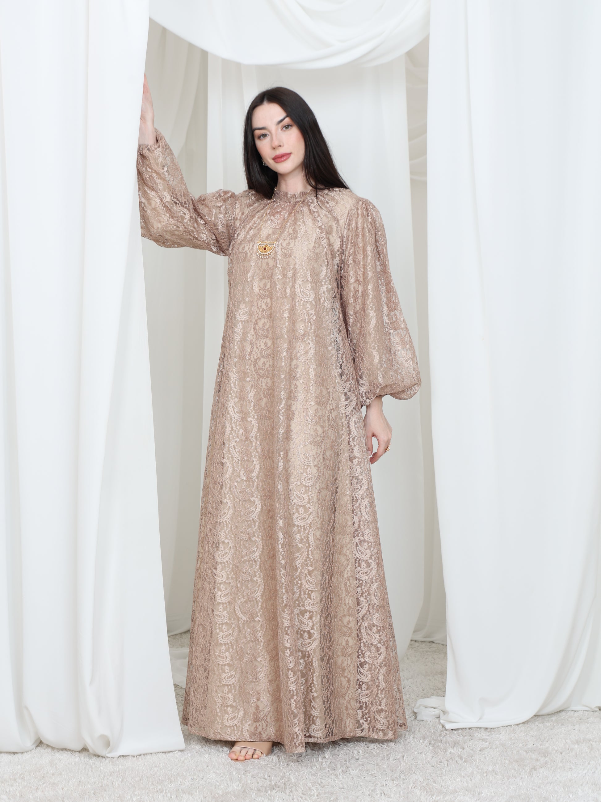 فستان مكون من قطعتين فستان داخلي بقماش كريب خفيف وفستان خارجي دانتيل عالي الرقبه بقصة كلوش فرنسيه واكمام طويله بنفخة امامية بسيطه عند معصم اليد