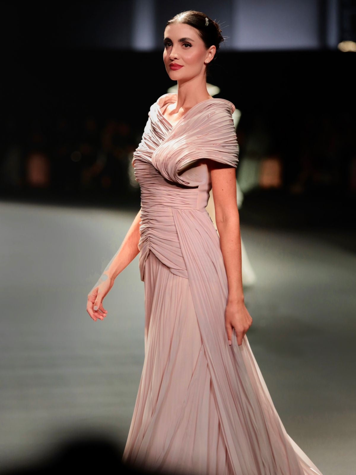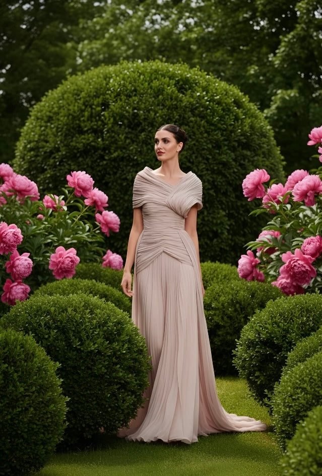فستان بطيات بليسيه شيفون ناعم ، اوف شولدر